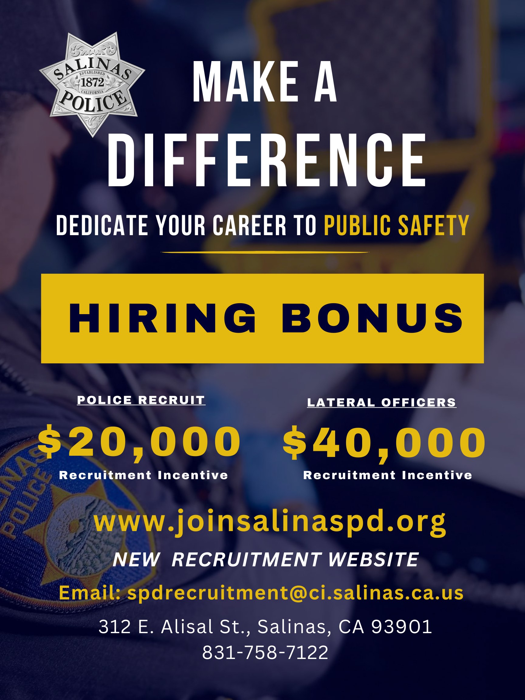 - 50% is paid upon successful completion of the police academy and the other 50% is awarded upon successful completion of one year as a Salinas police officer
