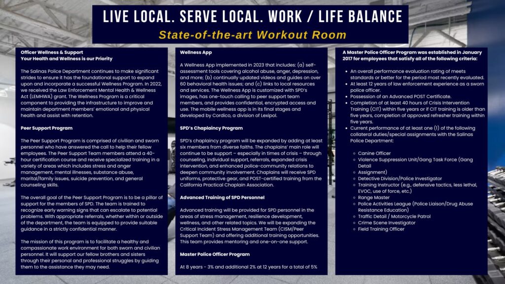 The Salinas Police Department continues to make significant strides to ensure it has the foundational support to expand upon and incorporate a successful Wellness Program. In 2022, we received the Law Enforcement Mental Health & Wellness Act (LEMHWA) grant. The Wellness Program is a critical component to providing the infrastructure to improve and maintain department members’ emotional and physical health and assist with retention.