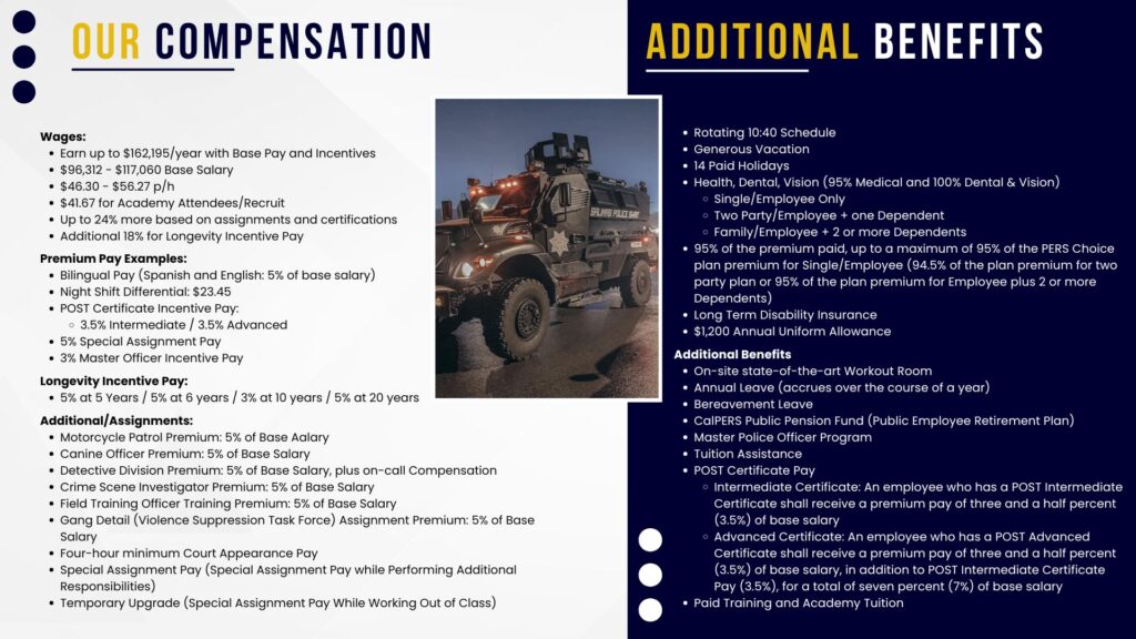 When you join the Salinas Police Department, you become part of our family. For that reason, your compensation package is designed to ensure that you can take excellent care of your own.